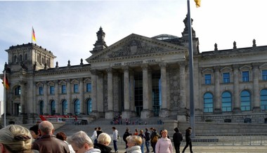 Siedzibą niemieckiego parlamentu – Bundestagu jest również miejscem obrad Zgromadzenia Narodowego, które odbywa się, co pięć lat, żeby wybrać nowego prezydenta. Budynek Reichstagu został poważnie zniszczony podczas pożaru w 1933 roku, a następnie wskutek działań wojennych. Został odbudowany dopiero w latach 60-tych XX wieku w całkiem innej formie, a w późniejszych latach przebudowany po zjednoczeniu Niemiec. Wspaniała architektura budowli nakrytej szklaną kopułą umożliwiającą obejrzenie sal obrad Reichstagu z góry. Naprzeciwko rządowe budynki o nowoczesnej architekturze z siedzibą Kanclerza Niemiec. Przy Reichstagu tablice, które są częścią pomnika 96 ofiar, działaczy, deputowanych do Reichstagu, zamordowanych w hitlerowskich obozach koncentracyjnych przez nazistów.“The memorial to the 96 Reichstag members of the opposition parties killed by the Nazis.”