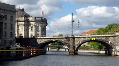 Zawracamy przepływając ponownie przez rejon gmachów rządowych wzniesionych niedawno po obu stronach rzeki obok siedziby parlamentu Niemiec, Reichstagu, budowli zachwycającej wszystkich swoją architekturą, wysmukłymi kolumnami i ogromną przeszkloną kopułą. Opływamy słynną Wyspę Muzeów (Muzeuminsel). W XIX w. wzniesiono tu monumentalne gmachy najważniejszych muzeów Berlina: Muzeum Pergamońskie (Pergamonmuzeum), Stare Muzeum (Altes Muzeum), Stara Galeria Narodowa (Alte Nationalgalerie) i Muzeum im. W. Bodego (Bode Muzeum), którego mury wychodzą prosto z wody - niczym weneckich pałaców. Za muzeami widać wielką kopułę katedry (Berliner Dom),neobarokową budowlę wzniesiono na przełomie XVIII i XIX w. Był to rodzinny kościół dynastii Hohenzollernów, których chowano w nawie świątyni. Obok brzydki pałac Republiki (Palast der Republik) z lat 70.Statek zawraca a my jeszcze raz podziwiamy piękno mijanych zabytkowych budynków i budowli.