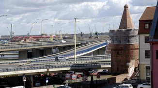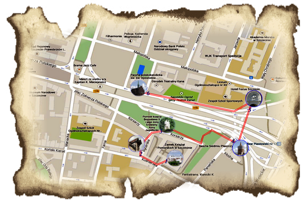 Trasa Zamkowa, licząca 2300 metrów, łączy ulicę Gdańską z placem Żołnierza Polskiego. Przebiega mostem na Parnicy, estakadą nad Łasztownią i ponownie mostem nad Odrą. Przechodząc koło Domu Rybaka zwróćmy uwagę na relief portalu, Domu Rybaka, z hanzeatyckim statkiem, - “kogą pod żaglami".Dalej w naszej wędrówce „ Złotym Szlakiem” wraz z moją wnuczką Alusią udamy się na Plac Solidarności. Zbyszek Mat