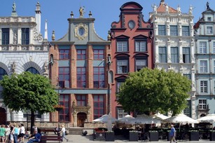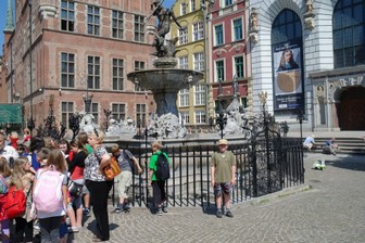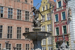 Przechodzimy obok Dworu Bractwa św. Jerzego i Domu Uphagena jednej z wielu kamieniczek przypominających o świetności Gdańska. Zatrzymujemy się przy słynnej gdańskiej fontannie Neptuna.Fontanna Neptuna - została zaprojektowana przez Abrahama van den Blocke. Podstawowym źródłem strumieni wodnych jest trójząb trzymany przez władcę mórz i oceanów w prawicy. Posąg został odlany 1615 roku. Kraty ze złotymi herbami Gdańska i polskimi orłami pochodzą z 1634 r.