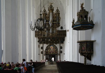 Sklepienie: sieciowe, gwiaździste i kryształowe, rozpięte prawie 30 metrów nad posadzką, jest podtrzymywane przez 27 filarów. Kościół mający ponad pół hektara powierzchni może pomieścić ponad 25 tysięcy osób. We wnętrzu podziwiać możemy m.in.: dębowy, późnogotycki ołtarz główny pochodzący z lat 1510-1517, belkę tęczową z grupą Ukrzyżowania. Czterometrowe postaci Chrystusa, Marii i świętego Jana oraz 10-metrowy krzyż zostały wykonane w 1517 roku. Przy Zakrystii znajduje się rekonstrukcja słynnego zegara astronomicznego z