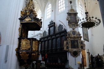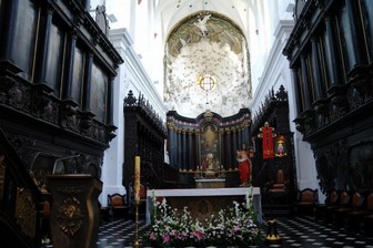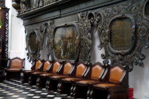 Dalej znajdują się renesansowe stalle (fundacja opata Dawida Konarskiego. Dębowe, dwupoziomowe ławy są pozostałością po zespole ław klasztornych.