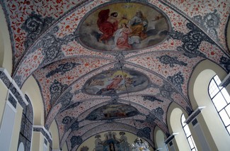 Powyżej mieści się stiukowe przedstawienie niebios pełne figur aniołów oraz postaci Starego i Nowego Testamentu. W centrum kompozycji znajduje się witraż przedstawiający Trójcę Świętą - jest to powojenne dzieło wykonane wg projektu Zofii Baudouin de Courtenay w miejsce zniszczonego w 1945 roku.