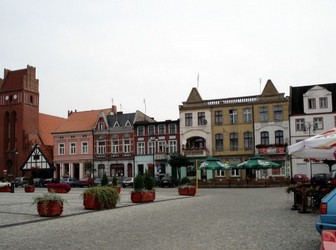 W północno – zachodnim narożniku rynku znajduje się drewniany dom z podcieniem zwany „Pod Kapturem” z XVIII wieku. Na ul Kościelnej wznosi się gotycka świątynia św. Katarzyny z 1 połowy XIV wieku. Kościół był kilkakrotnie niszczony przez pożary w 1414 roku, w końcu XVI wieku oraz w 1689 roku. Wewnątrz znajdują się fragmenty późnogotyckiej polichromii z początku XVI wieku, fragmenty renesansowego nagrobka wojewody pomorskiego Krzysztofa Kostki. Na wieży wisi gotycki dzwon z XV wieku.