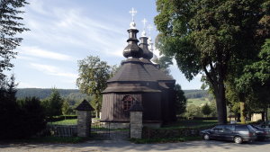 położona na wzniesieniu za potokiem Czarna, została zbudowana w 1764 roku a w pierwszej połowie XIX wieku została rozbudowa. Trójdzielna świątynia typu północno-zachodniego, drewniana o ścianach obitych gontem, izbica słupowej wieży oszalowana pionowo, poprzedzona przedsionkiem, obejmująca słupami babiniec. Zwieńczona jest baniastym hełmem z pozorną latarnią i małą cebulką. Podobne wieże wznoszą się nad nawą i prezbiterium. Świątynię otacza mur z płaskich, rzecznych kamieni.
