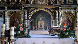 W górnej części ołtarza znajduje się obraz Zwiastowanie Najświętszej Marii Panny, a w prezbiterium nad wejściem do zakrystii umieszczono ikonę ze sceną Opłakiwanie Chrystusa.