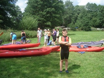 Tylko na północy Kaszub pozostały piaszczyste plaże, śnieżno-białe wydmy z klifowymi brzegami i błyszczało srebro "wielkiej wody"...Wieczorem uzgadniamy trasę spływu na dzień następny. Rano otrzymujemy mapki spływu z dokładnymi instrukcjami. Ubrani „na bojowo” mikrobusem p. Agnieszki Jankowskiej, u której mieszkamy (dosłownie spod drzwi) wraz z kajakami i innymi uczestnikami spływu zostajemy przewiezieni do Chocińskiego Młyna i tam rozpoczynamy nasz spływ. Po zwodowaniu kajaków na rzekę Chocina z mapami możemy kontynuujemy już samodzielnie nasz spływ. Nie jesteśmy związani z grupą ani z czasem, więc spokojnie możemy płynąć sami. Rzeka spokojna i bezpieczna, choć nie wolno zapominać nigdy, że to woda, choć tylko Chocina. Podziwiamy zmieniające się krajobrazy, biwakujemy na brzegu i po 6 godzinach wpływamy na jezioro Karsińskie. Przepływając jezioro Karsińskie dopływamy do brzegu „pod sam dom”. I to jest jedna z zalet pobytu „ U Agi”. Zaczynając spływ, wychodząc z pokoju ubrani „na bojowo”, kończymy go przed drzwiami naszego pokoju.