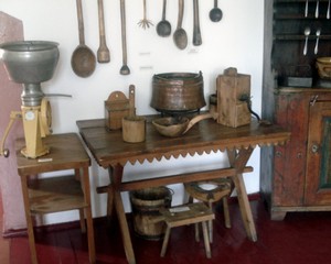 Gospodarstwo domowe – przedstawiono tu narzędzia stosowane do mierzenia płodów rolnych, ich przechowywania, przetwarzania żywności oraz podstawowy sprzęt kuchenny. Jest, zatem beczka na zboże wydrążona w pniu, korzec i mace plecione z korzeni sosny. Widoczne są również przyrządy służące do obróbki ziarna stępa ręczna do łuszczenia zboża na kaszę. Różnorodną natomiast kolekcję stanowią foremki do masła oraz wałeczki stosowane do uzyskiwania na wytworzonym maśle elementu dekoracyjnego.