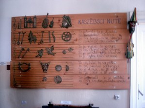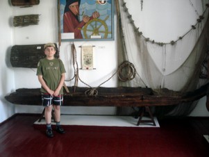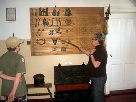 Izba kaszubska i tradycja kaszubska - zgromadzono tu sprzęty i meble codziennego użytku oraz wyposażenie tradycyjnej izby kaszubskiej. Nie podobał mi się „pyzder”- dyscyplina, która wisiała pod ręką na łóżku rodziców i służyła do karania nieposłusznych dzieci. Przecież jestem grzeczny tylko nieraz dziadziuś na zamkach krzyżackich zamyka mnie w dyby lub wiąże do pręgierza. Ale „pyzdra” nigdy nie stosuje.Z wielką przyjemnością dzięki uprzejmości Pani z muzeum przeszliśmy lekcję nauki alfabetu kaszubskiego i teraz sami możemy go powtarzać: