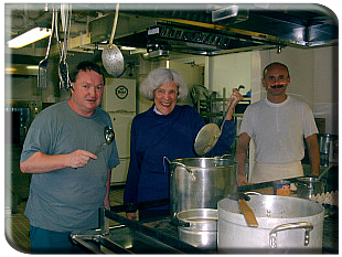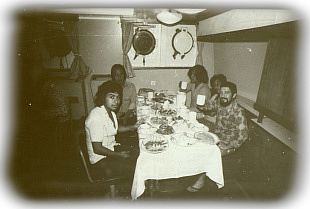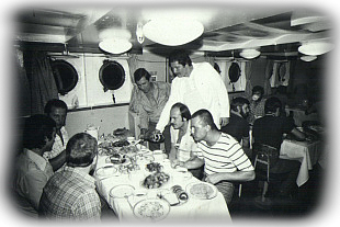 Bo po miesiącach w rejsie, szczególnie gdy ryba nie szła i pływało się za podwójną gwarancyjną, to najłatwiej było narzekać na kuchnię i proponować „kucharza na gorąco” lub „za burtę". Rano 7:30-8:30 śniadanie, a tu można było zobaczyć, jak szeroki repertuar z jajek można było zamawiać u stewardów: - na miękko, na twardo, luźne, ścięte, ze szczypiorkiem, na boczku, na szynce, w szklance ….. i dziesiątki innych jajecznych życzeń załogi. Zawsze zastanawiałem się, jak oni potrafią przyjąć taką różnorodność zamówień i szybko zrealizować je spełniając nasze życzenia. A my....., szybko zjeść..., i na 8:00 na wachtę. Cztery godziny wachty i 11:30-12:30 obiad. I często „niespodzianki Pana Janka”, bo to naprawdę prawdziwy „mistrz patelni” był. 15:00-16:00 podwieczorek, a więc zawsze coś na słodko i 17:00-18:00 kolacja zazwyczaj na „gorąco”. I tak „dzienna uczta” dobiegała do końca, a o 20:00 zaczynało się „nocne żarcie” (bo to zmiana wacht w maszynie i na mostku), o 22:00 w czasie połowów zmiana załogi połowowej na pokładzie, o północy zmiana wacht na mostku i w maszynie a o 2:00 zmiana na przetwórni. Nocny steward tylko uzupełniał zawartość lodówki w pentrze i szykował i donosił, donosił (nie, nie o tym, o czym myślisz), donosił nocne porcje. Ten powtarzający się „rytuał” powodował też dodatkowe spotkania, rozmowy i wymianę informacji wśród załogi. Bo zawsze ktoś tam zadzwonił przez radio do domu, a i na mostku można było w „Bierozce” posłuchać Radia Szczecin i „dla tych, co na morzu”. A wolno płynie „łajba stara” w „biodrach” się kołysze.....,