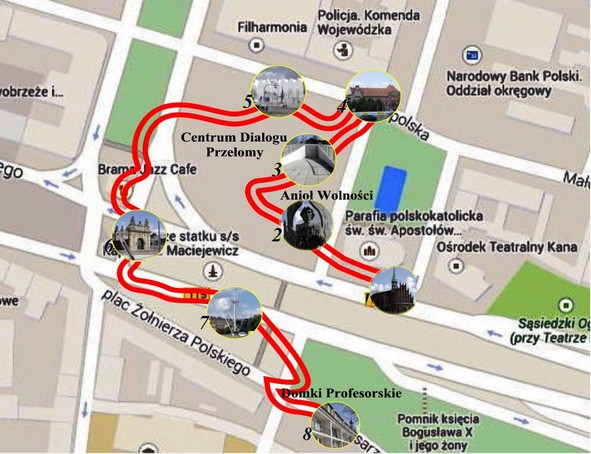 Wychodząc z (1) kościoła św. Piotra i Pawła jesteśmy na placu Solidarności. Na placu (2) „Pomnik Ofiar Grudnia 1970” , i (3) Centrum Dialogu -”Przełomy”. Po prawej stronie (4) budynki komendy Policji z 1905 roku i (5) nowy Filharmonii Szczecińskiej. Wracając w kierunku zamku mijamy (6) Bramę Królewską, (7) Pomnik „Maszt statku Konstanty K. Maciejewicz” i (8) Domki Profesorskie.