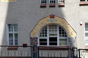 Dalej mijamy szkołę zbudowaną w 1910 r., obecnie Gimnazjum z umieszczoną sztukaterią z herbem Wałcza. Powyżej zegar słoneczny ( …a godziny piątej nie ma..)