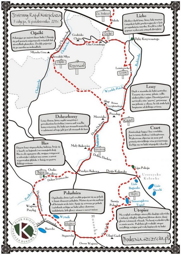 Dziś wyruszamy szlakiem pełnym opowieści o duchach, duszkach i demonach zamieszkujących w dzikich ostępach Bukowej. Z miejsca spotkania wyruszamy dość liczną grupą w kierunku leśniczówki gdzie w okolicy można spotkać Leśne Licho – złośliwego leśnego duszka, który lubi straszyć i niepokoić ludzi przebywających w lesie, szczególnie w nocy, – bo „Licho nie śpi”. Bezpiecznie prowadzeni przez dobre duszki dochodzimy do leśniczówki, bo tu możemy spotkać demona o imieniu Leszy. Leszy troszczy się o zwierzynę leśną i sam las. Dawniej pasterze, aby żyć dobrze z Leszym przynosili mu jedzenie, aby ich stada były bezpieczne od dzikiego zwierza. A więc Leszy to taki pomocnik leśniczego.