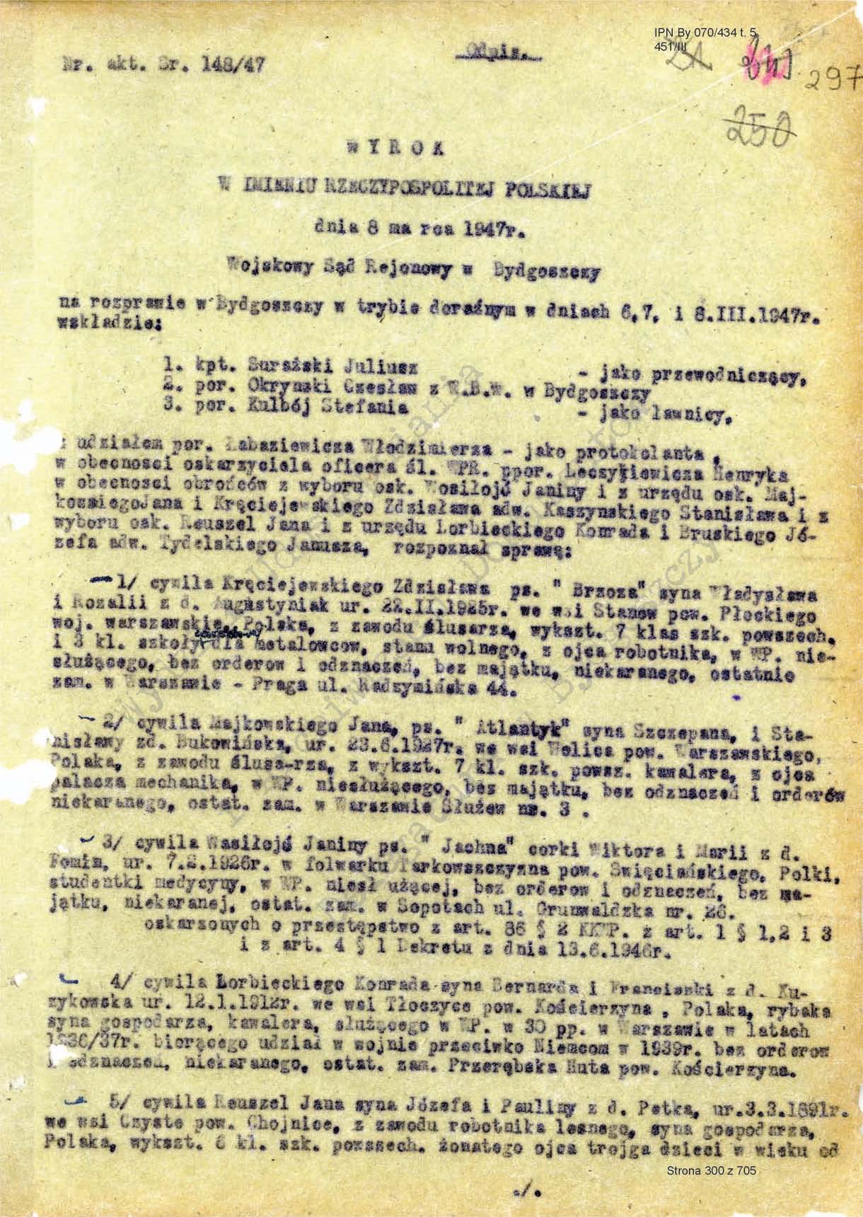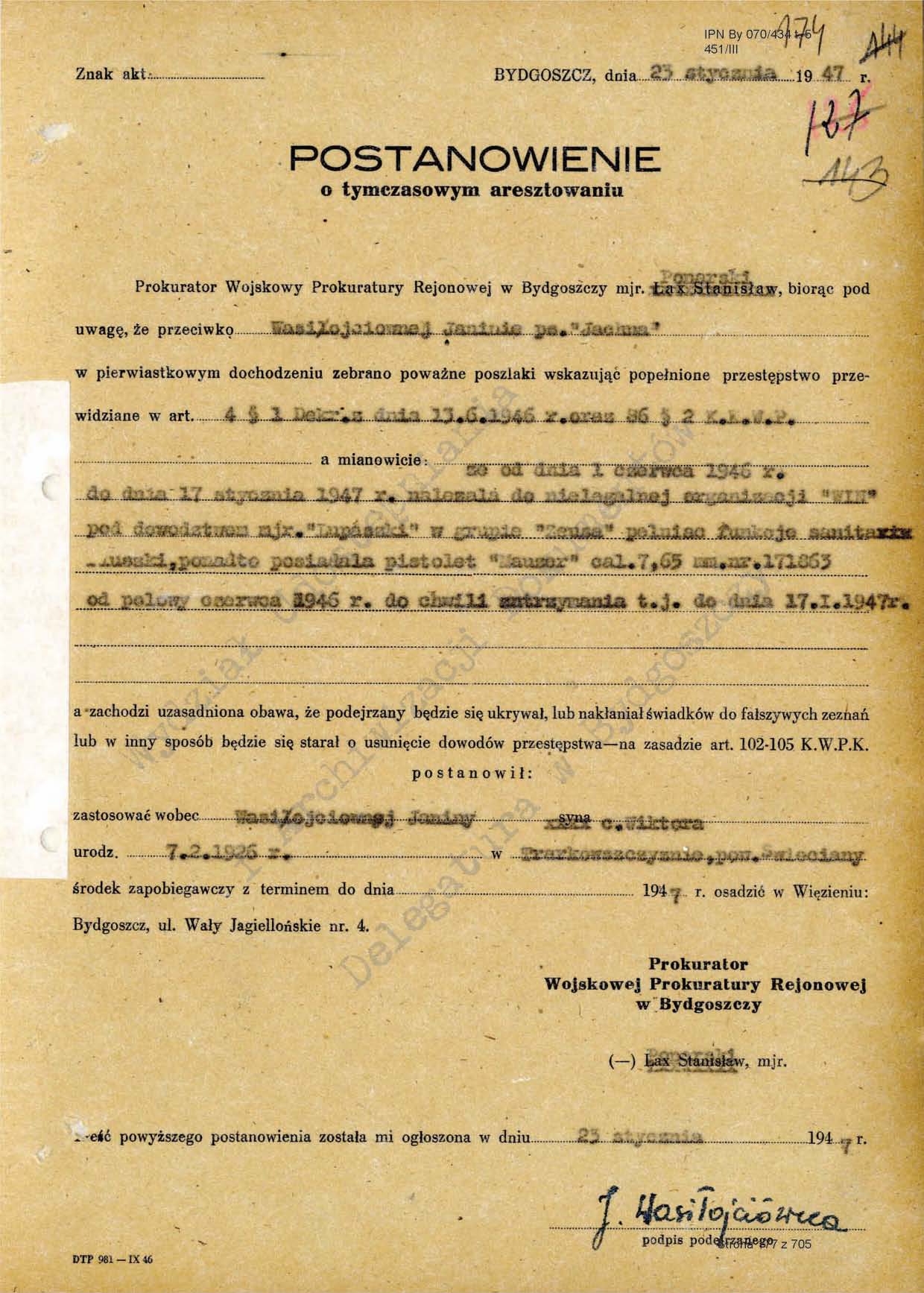 Kiedy w listopadzie 1946 r. szwadron uległ demobilizacji, Janina Wasiłojć i Leon Smoleński udali się do Zielonej Góry. W Zielonej Górze wynajęli mieszkanie a „Jachna” zapisała się na kurs sanitarny PCK, który dawał jej możliwość zatrudnienia w szpitalu. „Normalne życie” nie trwało jednak zbyt długo. W styczniu 1947 r. „Jachna” została aresztowana. Polecenie zatrzymania Janiny Wasiłojć dotyczyło tylko „Jachny”, dlatego nieświadomi z kim mają do czynienia miejscowi funkcjonariusze nawet nie zainteresowali się leżącym w tym samym pokoju w dużej gorączce „Zeusem”. Janinę Wasiłojć przewieziono do Bydgoszczy i osadzono w Areszcie Karno – Śledczym. Po niezwykle brutalnym i wyczerpującym śledztwie 8 marca 1949 r. w trybie doraźnym wyrokiem Wojskowego Sądu Rejonowego w Bydgoszczy skazano „Jachnę” na dwukrotną karę śmierci. Był to najwyższy wyrok w toczącym się wówczas procesie. W czasie przesłuchań i procesu „Jachna” zachowywała się bardzo dzielnie, irytując swoja postawą przedstawicieli totalitarnego reżimu. W trakcie odczytywania wyroku, towarzysz broni Jan Makowski „Atlantyk”, również skazany w tym procesie na karę śmierci, wyszeptał w czasie odczytywania uzasadnienia wyroku: „Jachna mnie będą strzelać tylko raz, ale ciebie z przodu i z tyłu”. „Jachna” usłyszawszy to zaśmiała się co sąd uznał za oznakę zapalczywości i wyjątkowej zuchwałości.