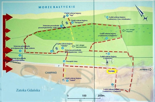 Zwiedzanie rozpoczynamy idąc poprzez camping „Maszoperia” w kierunku plaży. Tam znajduje się nad samą zatoką, ciężki schron bojowy „ Sokół” ( punkt 2 na planie) : Konstrukcja ścian o grubość żelbetonu do 220 cm Wyposażony był w ciężkie karabiny maszynowe i erkaemy i opancerzony reflektor.