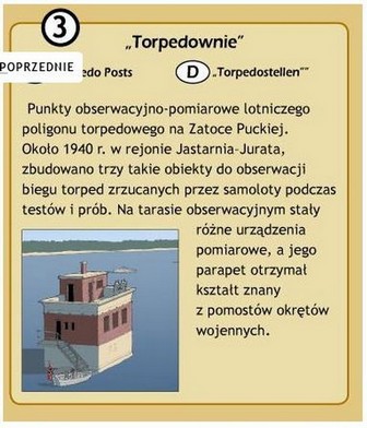 Na wodach Zatoki Gdańskiej, zbudowano trzy takie obiekty. Służyły do obserwacji torped lotniczych przez samoloty z eskadry Luftwaffe zrzucanych przez samoloty podczas prób. Dwa punkty obserwacyjne, usytuowane na płyciznach pomiędzy Jastarnią a Juratą, są zachowane do dziś i widoczne na Zatoce. Jedną z wież w latach 90. XX wieku zakupił od Urzędu Morskiego prywatny przedsiębiorca, który planował wykorzystać obiekt komercyjnie i założyć w niej restaurację, co ostatecznie się nie udało.