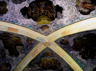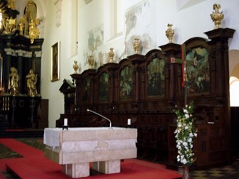 najprawdopodobniej Franciszka Józefa Mangoldta oraz marmurowe ołtarze pokazują kunszt twórców. W długim prezbiterium stanowiącym chór zakonny znajdują się stalle z XVII wieku, ozdobione motywami z życia świętych, w tym św. Benedykta. Przechadzając się krużgankami klasztornymi trzeba zwrócić uwagę na tablice marmurowe związane z historią zakonu. Najstarsza mówi o roku 1044. Tablica św. Benedykta z maksymą „ ucz się i pracuj i nie bądż smutny „ z okazji jubileuszu w 2000 roku. W krużgankach pokazane są elementy pozostałości dawnych zabudowań wzgórza ocalałych i odkrytych i ocalałych w czasie prac renowacyjnych i odbudowy klasztoru. Na odkrytych elementach ściań można zobaczyć stare freski spod warstwy usuniętego tynku.