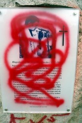 Udajemy się następnie brzegu rzeki mijając kamień upamiętniający, Ks. Jerzego Popiełuszkę.Tablica pamiątkowa zamazana farbą. Ile trzeba głupoty i braku elementarnych cech człowieka, aby zdobyć się na takie zbezczeszczenie pamięci o innym człowieku.