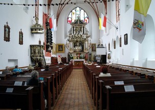 Zbliżamy się do kościoła Najświętszej Marii Panny. Tablice przed kościołem zachęcają do chwili modlitwy i zadumy a piękno wnętrza kościoła pokazują fotografie.