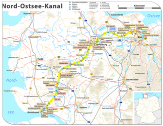 Zbudowany został w latach 1887-1895, po raz pierwszy oddany do użytku w 1895 roku jako Kanał Cesarza Wilhelma.98 637 m długości i 102 m szerokości z 2 zestawami śluz umieszczonych na końcach kanału (stare śluzy o komorach długości 125 m i nowe śluzy o długości 310 m). Przejście przez kanał skraca drogę o około 250 mil morskich (około 460 km) w stosunku do tradycyjnej drogi przez Cieśniny Duńskie – wokół Półwyspu Jutlandzkiego.