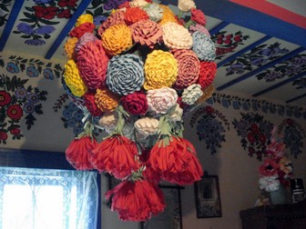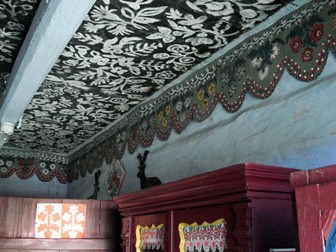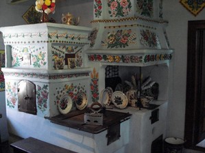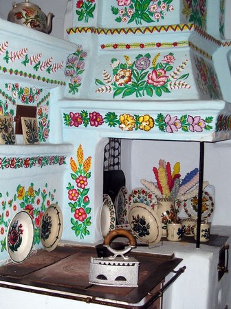 Pierwotne zdobnictwo skupiło się wokół wielkiego, wielofunkcyjnego pieca, z czasem dziewczęta zaczęły malować girlandy kwiatów wokół obrazów, okien, odrzwi.